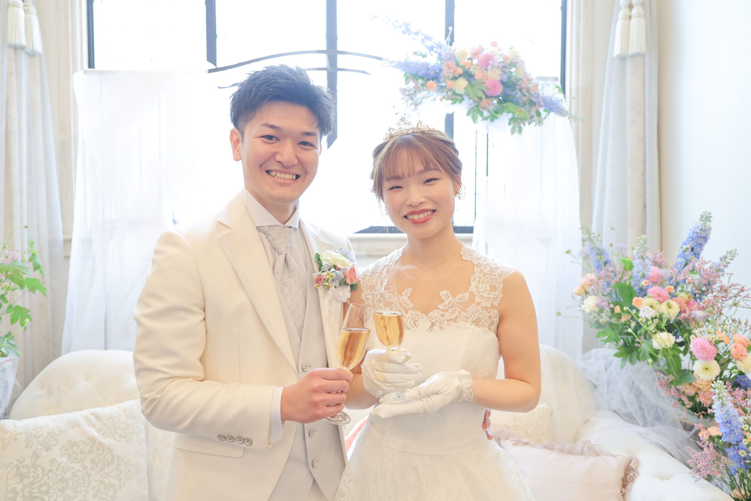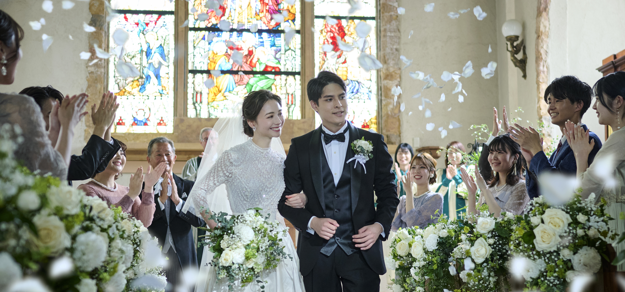 ステンドグラス越しに柔らかな外光が射し込み、ふたりとゲストを優しく照らし、
